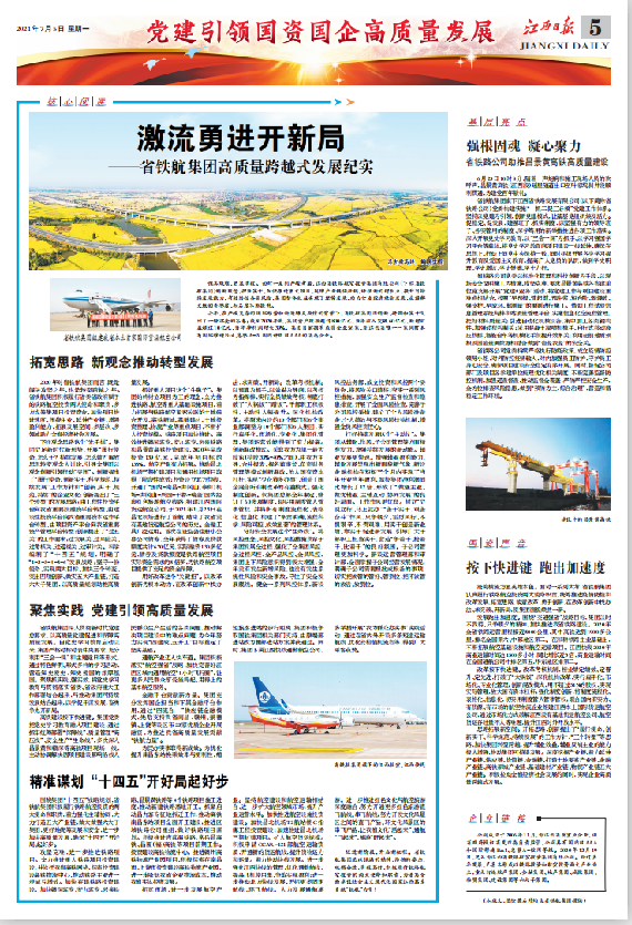 发展跑出加速度。围绕“交通强省”战略目标,集团以时不我待、只争朝夕的精神,加快推进我省铁路建设。2020年全省铁路运营里程接近5000公里,其中高铁达到1900多公里,排名全国第六、中部地区第二。在深耕铁路主业基础上,不断拓展航空基础设施和航空运输项目。江西快线2020年商业运输时间达1500多小时,同比增长近3倍,商业运输时间在全国通航公司中排名第五,华东地区排第二。